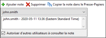 Utilisez les notes d'interaction pour consulter, ajouter, supprimer ou copier des notes. Cette section apparaît dans la boîte de dialogue Propriétés de l'interaction, ainsi que dans l'onglet Interactions. Elle apparaît également dans l'onglet Interactions des boîtes de dialogue Propriétés du contact, Propriétés pour Organisation et Propriétés du site. Pour plus d'informations, consultez les rubriques Modification des informations d'un contact Tracker, Modification des informations d'une organisation Tracker ou Modification des informations d'un site Tracker.