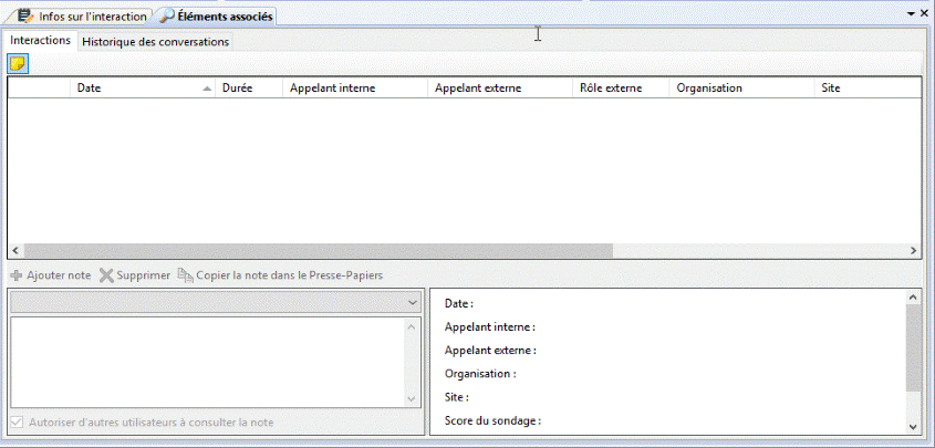 L'onglet Interactions affiche une liste des interactions associées à l'interaction actuellement sélectionnée dans Mes interactions. Il permet également d'afficher, d'ajouter ou de supprimer des notes liées à ces interactions apparentées. Astuce : Vous pouvez configurer les critères de recherche pour déterminer les interactions apparentées qui apparaissent dans cette vue. |