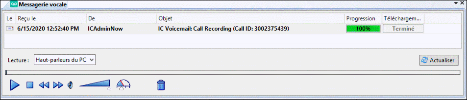 Remarque : avant de pouvoir utiliser la vue Messagerie vocale, vous devez la rendre disponible en tant que vue dans le client CIC. Pour plus d'informations, consultez la rubrique Vue Messagerie vocale.