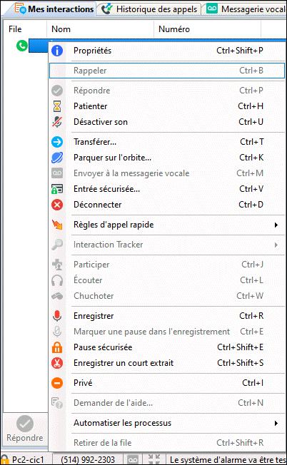 Vous pouvez afficher les raccourcis de contrôle de file d'attente actuellement disponibles en cliquant avec le bouton droit de la souris sur une interaction dans Mes interactions ou dans l'onglet d'une autre file. Cela affiche le menu de raccourcis de l'interaction actuelle. Les actions indisponibles pour l'interaction actuelle sont grisées.