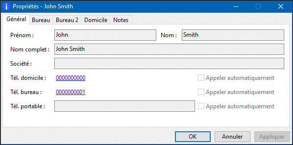 Si vous souhaitez numéroter automatiquement le numéro de téléphone et le numéro de poste dans cette boîte de dialogue Propriétés, cliquez sur le lien hypertexte Poste.
