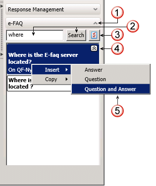 Vous pouvez afficher, sélectionner et utiliser une réponse prédéfinie à une question fréquente dans une session de chat ou lors d'une réponse à un email acheminé par ACD. Pour plus d'informations, consultez la rubrique Utilisation d'e-FAQ.