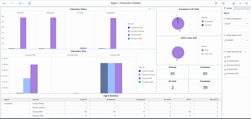 The Agent Details dashboard provides information about agent details, by workgroup. The visualizations display agent statistics for total interactions answered, completed, and on hold. The Agent Details dashboard also displays the average handling times for an agent, with positive and negative scores.