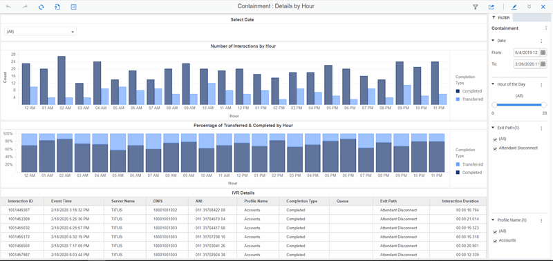 The Containment Details by Hour dashboard displays IVR details by Hour, for a selected date. The visualizations in this dashboard display IVR statistics for interactions, by Hour and by Completion Type.