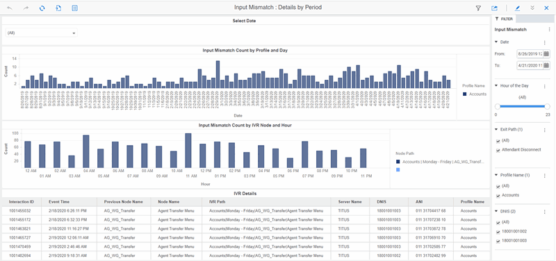 To know about the elements used in the Input Mismatch Details by Period dashboard, see IVR Dashboards Data Dictionary.