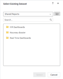 On the Select Existing Dataset dialog box, you can click the Shared Reports list and select the dataset, or you can search and select the dataset. For more information about Select Existing Dataset, see https://www2.microstrategy.com/producthelp/Current/MSTRWeb/WebHelp/Lang_1033/Content/add_existing_datasets.htm.