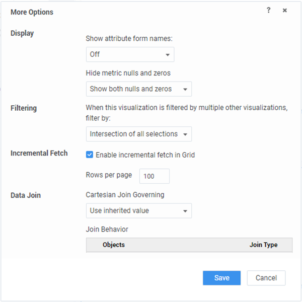 More Options for Visualization can be accessed from the edit menu in the visualizations tab and is used for Filtering, Incremental Fetch, Data Join and Display options.
