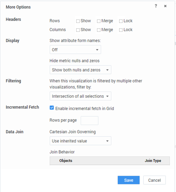 In earlier versions an option for Headers was also included in the more options sections of visualization. It included filter for Rows and Columns as Show, Merge and Lock. This feature is not included in the MicroStrategy 2021 version.