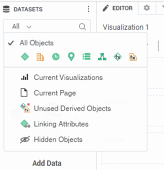 Current Visualization, Unused Derived Objects and other options are present. Also one can view all Metrices, Time and Geo Attributes, Custom Groups, Hierarchies and some more objects filter.