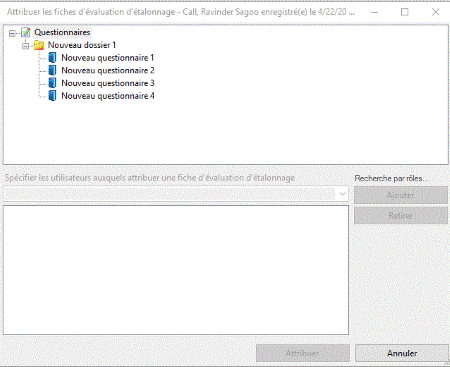 Utilisez la boîte de dialogue Attribuer les fiches d'évaluation d'étalonnage pour attribuer un questionnaire à l'enregistrement et spécifier les évaluateurs auxquels attribuer la fiche d'évaluation d'étalonnage.