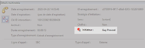Lorsque le type d'enregistrement est un extrait d'enregistrement, le volet Détails multimédia affiche la valeur de l'attribut Initiateur, indiquant l'utilisateur qui a initié l'extrait d'enregistrement.