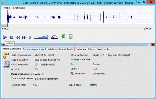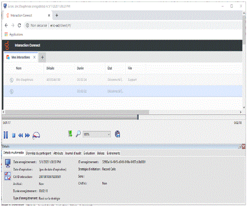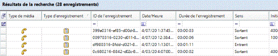 Pour lire un appel enregistré, dans la vue Résultats de la recherche, dans la liste des interactions enregistrées, double-cliquez sur un appel.
