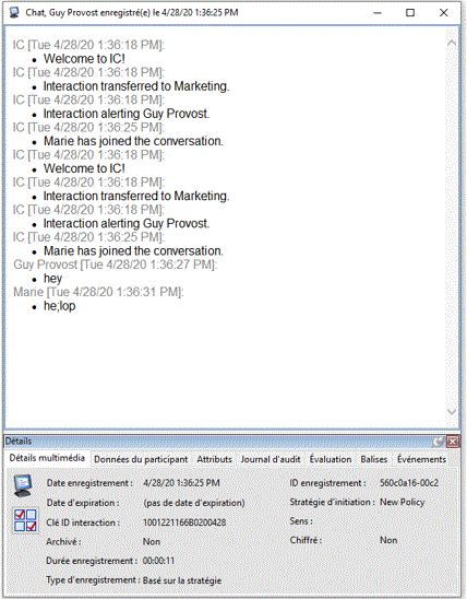 La fenêtre Lecture de chat apparaît. Les pages Détails de l'interaction sont affichées au bas de cette fenêtre pour votre référence. Vous pouvez utiliser la page Évaluation pour ajouter un questionnaire ou pour évaluer cet enregistrement.