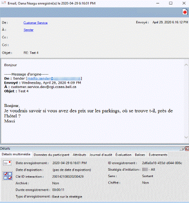 La fenêtre Lecture d'email apparaît. Les pages Détails de l'interaction sont affichées au bas de cette fenêtre pour votre référence. Vous pouvez utiliser la page Évaluation pour ajouter un questionnaire ou pour évaluer cet enregistrement.