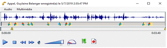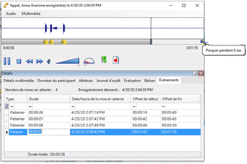Un événement Mise en attente est indiqué par un triangle jaune ; un événement Transfert par un triangle violet ; et un événement Parquer par une flèche bleue. Le texte décrivant l'événement apparaît lorsque l'enregistrement atteint l'indicateur d'événement lors de la lecture.