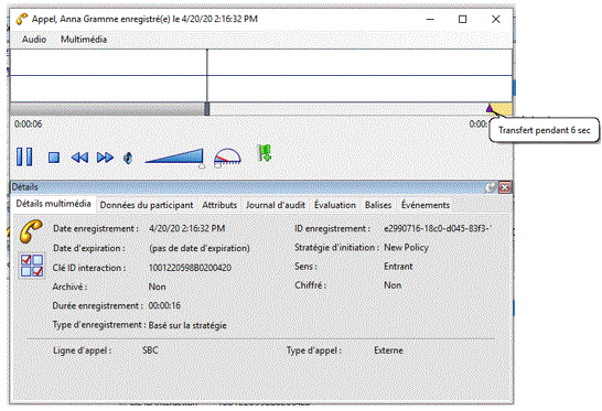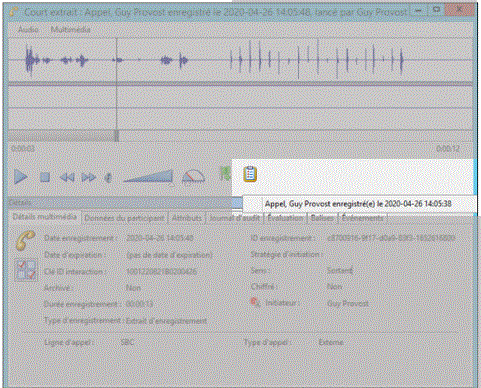 Lorsque vous écoutez un extrait d'enregistrement, s'il existe un enregistrement basé sur la stratégie associée à cette interaction, une commande d'enregistrement associé est disponible.