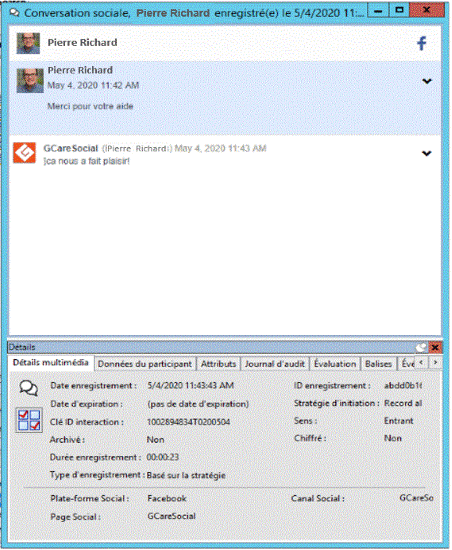 La fenêtre de lecture Conversation sociale apparaît. Les pages Détails de l'interaction sont affichées au bas de la fenêtre pour référence. Vous pouvez utiliser la page Évaluation pour ajouter un questionnaire ou pour évaluer l'enregistrement.