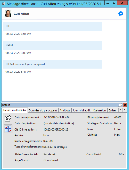 La fenêtre de lecture Message direct social apparaît. Les pages Détails de l'interaction sont affichées au bas de la fenêtre pour référence. Vous pouvez utiliser la page Évaluation pour ajouter un questionnaire ou pour évaluer l'enregistrement.