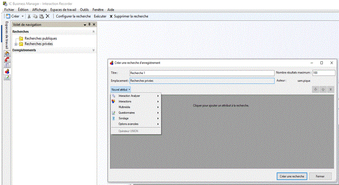Les recherches d'enregistrements sont créées pour récupérer les interactions enregistrées. Dans le volet de navigation d'Interaction Recorder, vous pouvez créer des recherches d'enregistrements publiques et privées. Les recherches sont ensuite faciles à créer dans l'espace de travail à l'aide de la commande Créer une recherche et en sélectionnant des attributs de recherche. Les attributs de recherche sont regroupés dans six catégories principales :