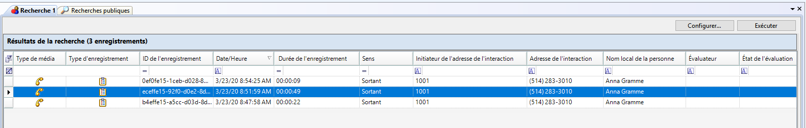 Selon les attributs de la recherche d'enregistrement, une fois une recherche exécutée, les résultats sont affichés dans la vue Résultats de la recherche de l'espace de travail. Une liste des interactions enregistrées s'affiche dans une grille en haut de l'espace de travail, fournissant les détails de l'interaction.