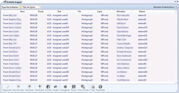 Les boutons de la barre d'outils Contrôle des appels permettent d'effectuer une action téléphonique sur la sélection de la file d'attente actuellement affichée. Si une action ne peut pas être effectuée, le bouton est grisé. Voir Contrôle des appels pour plus de détails.