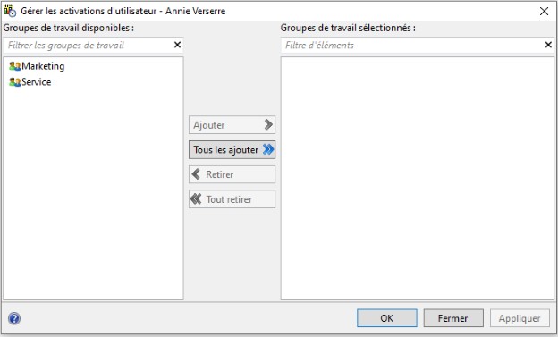 Pour activer la participation de l'utilisateur à un groupe de travail, sélectionnez un ou plusieurs groupe(s) de travail dans la liste des groupes de travail disponibles. Vous pouvez maintenir la touche Ctrl enfoncée pour sélectionner plusieurs entrées simultanément. Puis, cliquez sur Ajouter. Vous pouvez éventuellement cliquer sur Tout ajouter pour activer l'utilisateur sur tous les groupes de travail disponibles.