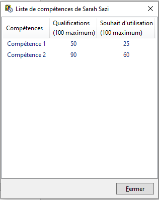 La boîte de dialogue Liste de compétences affiche les compétences associées à un utilisateur de groupe de travail, ainsi que ses capacités et sa motivation pour utiliser chacune de ces compétences. Pour afficher cette boîte de dialogue, faites un clic droit sur une commande de l'annuaire du groupe de travail. Sélectionnez ensuite Afficher les compétences.