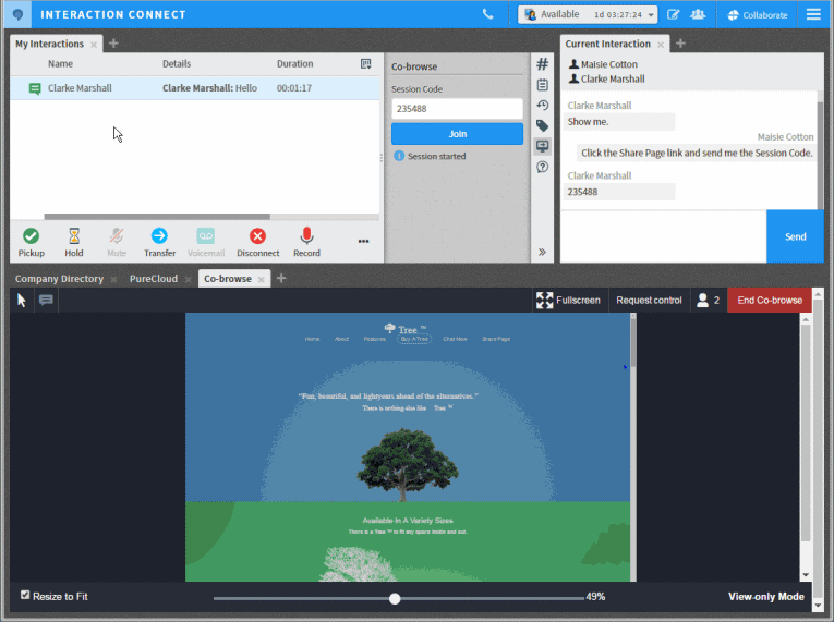 Interaction Connect has a new 'Co-Browse View'. This view is coupled with the new Co-browse sidebar in My Interactions. Together the new view and sidebar enables agents to assist customers by establishing co-browse sessions which are associated with an interaction.