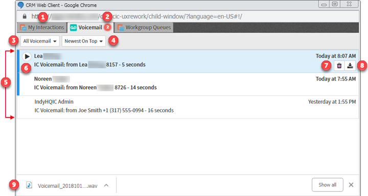 The My Interactions view also appears in the browser window. You can switch back to this view while managing voicemail messages and manage other currently connected interactions. |