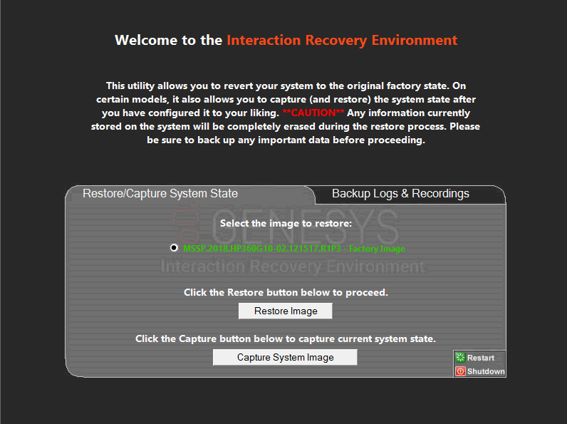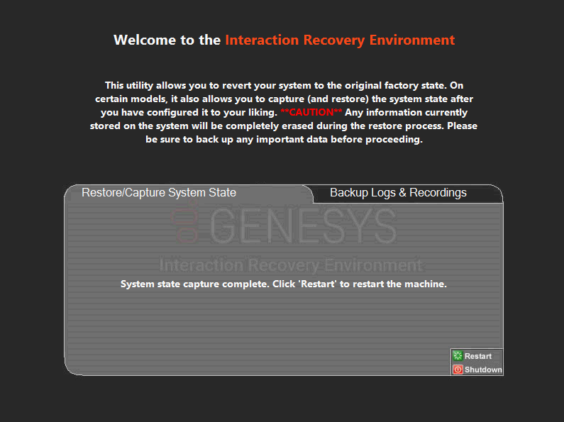 Interaction Application Server only: The capture process saves the OS partition ONLY. Therefore, Genesys strongly recommends that you back up any data that you might need after restoring this user-configured image in the future.