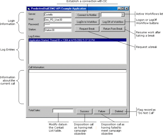 The API includes a sample application, written in VB6, that illustrates techniques used to create a Predictive Dialer COM application.