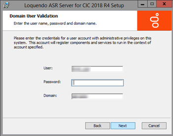 Select which components to install or install the complete package and then click Next. The Domain User Validation page appears.