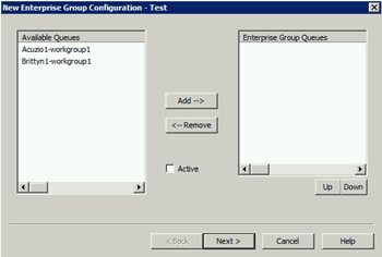 To remove a queue from the group, click the queue in the Enterprise Group Queues list box and then click <--Remove. The queue moves to the Available Queues list box.