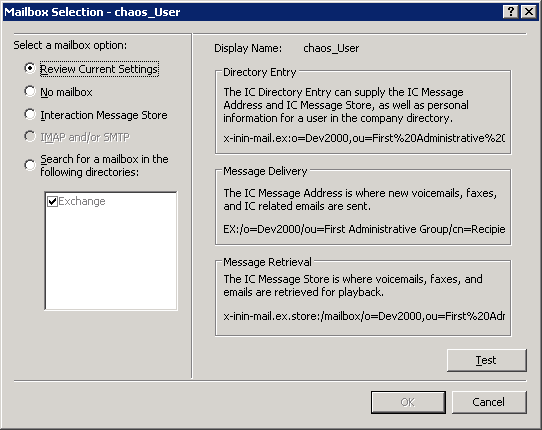On the Configuration page of the User Configuration dialog box, click (...) to the right of Mailbox User. The Mailbox Selection dialog box appears.
