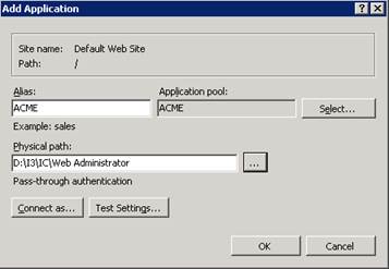 In the Alias box, type a name that matches the Application Pool name specified in step 3 of Creating an application pool. For example, ACME.