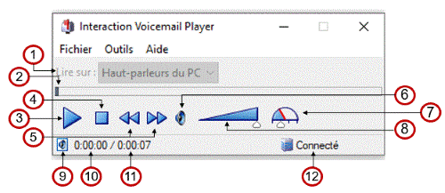Les commandes d’Interaction Voicemail Player fonctionnent de façon similaire aux commandes des autres lecteurs multimédias pour la lecture des messages vocaux.