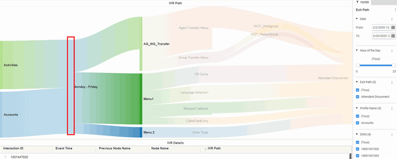 Using the Exit Path Details by Sankey Dashboard, for an example: To know the detail of the interactions which entered Monday-Friday Schedule, click the vertical line before the Monday-Friday text on the Sankey chart.