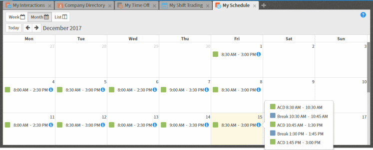 The Schedule Month view displays the start and end times for your shift on each day. To display schedule details for a selected day, click the information icon in the selected day.