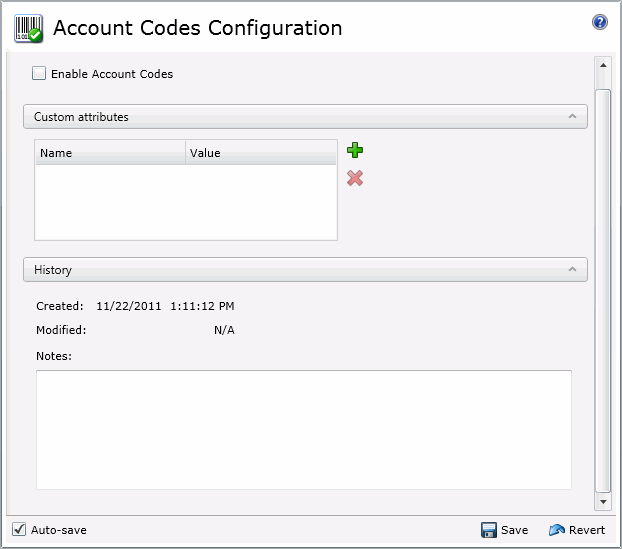 The View Account Codes Configuration page displays account codes configuration in the master view.