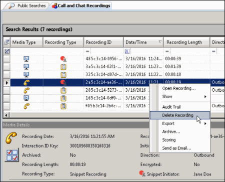 Use the Search Results View to delete a recording. When a search is run, a list of recorded interactions is displayed in a grid in the Search Results View in the Workspace.