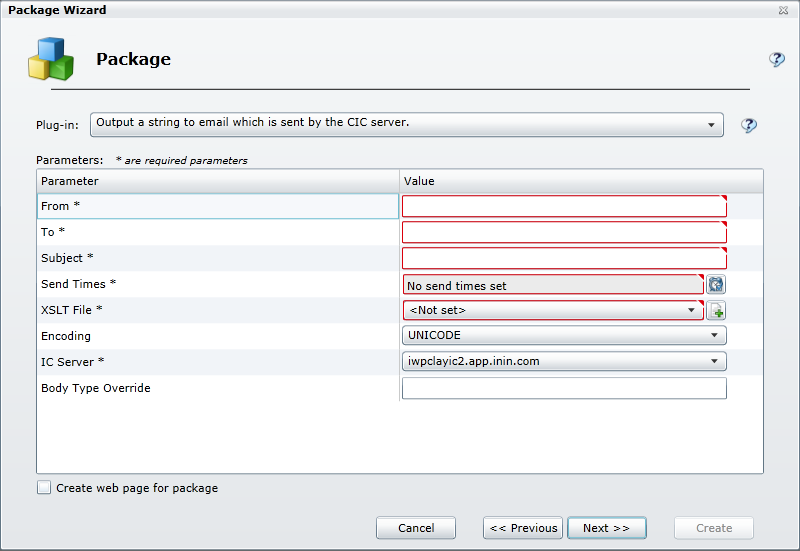Once you select one of the available plug-ins for the Other package type, a set of parameters that are associated with that plug-in will appear in the middle section of the page. While some parameters are the same for all Plug-ins, the majority of the parameters are specific to the type of Plug-in that you select.