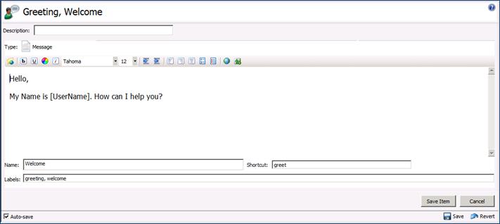 The editor is based on the response type you are creating. For a message or URL, you use the HTML editor. For a file, you use the drag-drop target editor. You can now assign shortcuts to responses to allow quick access to the most commonly used responses. You can also label responses to improve search functionality and make it easier for users to get the correct response quickly.