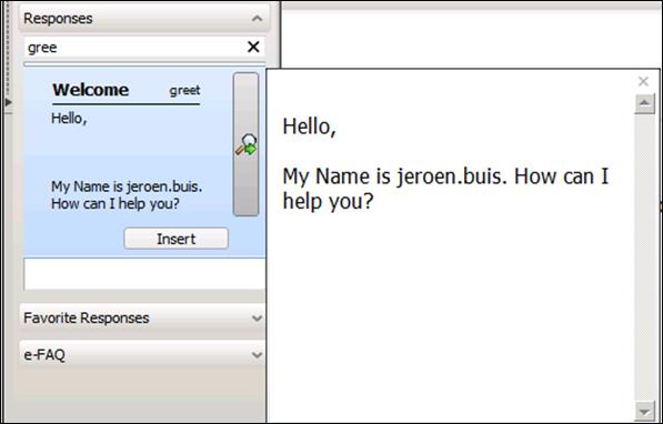 The response sidebar in Interaction Client now contains an in-dialog search option. Users can quickly search all responses and can preview the actual response before adding it. The following figure shows the in-dialog sidebar.