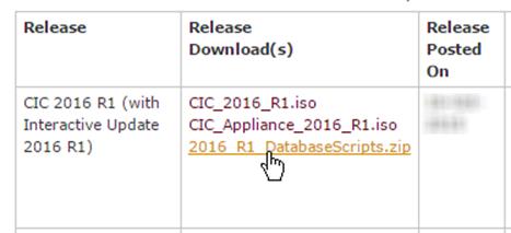 Starting in CIC 2016 R1, a .zip file containing the Microsoft SQL Server and Oracle database scripts is available for each release and patch of the .iso file, and as a separate download on the Downloads page on the PureConnect Product Information site.