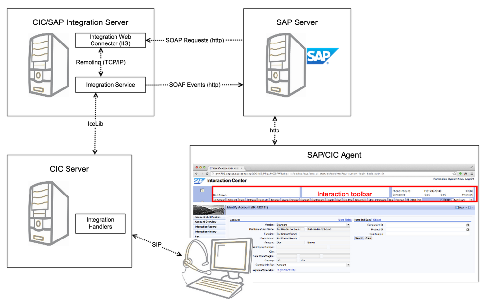 The integration server sits between SAP and CIC. The integration is a Windows service that starts when the integration server starts. Multiple Windows services can communicate to multiple CIC servers and multiple SAP servers at the same time. On smaller implementations with fewer than 25 agents, the integration is typically installed directly on the SAP servers—only if the SAP servers are on Windows-based platforms.
