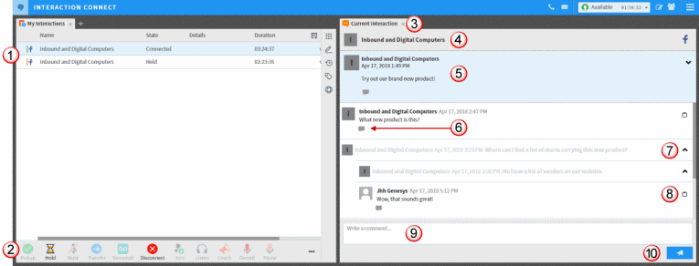 Note: You cannot start a Facebook conversation from Interaction Connect. You participate in Facebook conversations by making comments and replying.