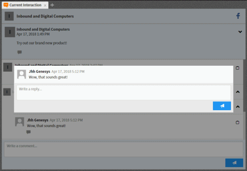 Note: Your replies appear on your company's Facebook page or your company's Tweets and replies page. Your replies also appear in the Current Interaction view after a short interval. You cannot reply to comments or Tweets for held or disconnected interactions.