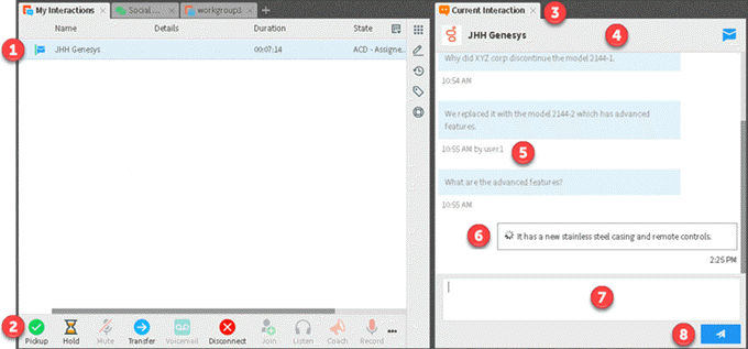 To pick up, place on hold, transfer, record, or disconnect a Facebook interaction, use the Queue Control toolbar buttons. The Pickup button also appears in the Current Interaction view for alerting and held interactions.