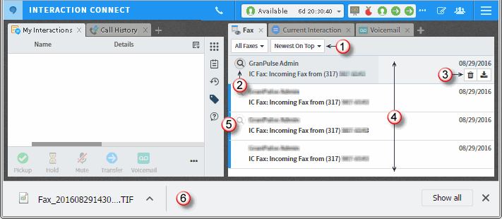 The Fax view contains the Faxes list. This list contains the faxes you have not yet deleted, including both previously viewed and unviewed faxes. |