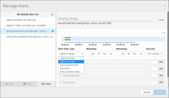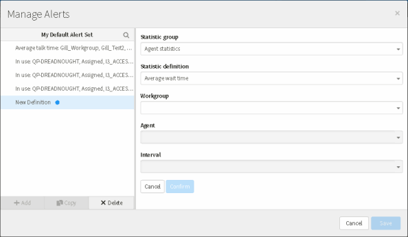 Remarque : l'apparence de la boîte de dialogue Gérer les alertes varie en fonction de la statistique sélectionnée. Par exemple, la statistique Durée moyenne d'attente propose trois paramètres : Groupe de travail, Agent et Intervalle (comme Période de travail actuelle). D'autres statistiques exigent des paramètres différents.
